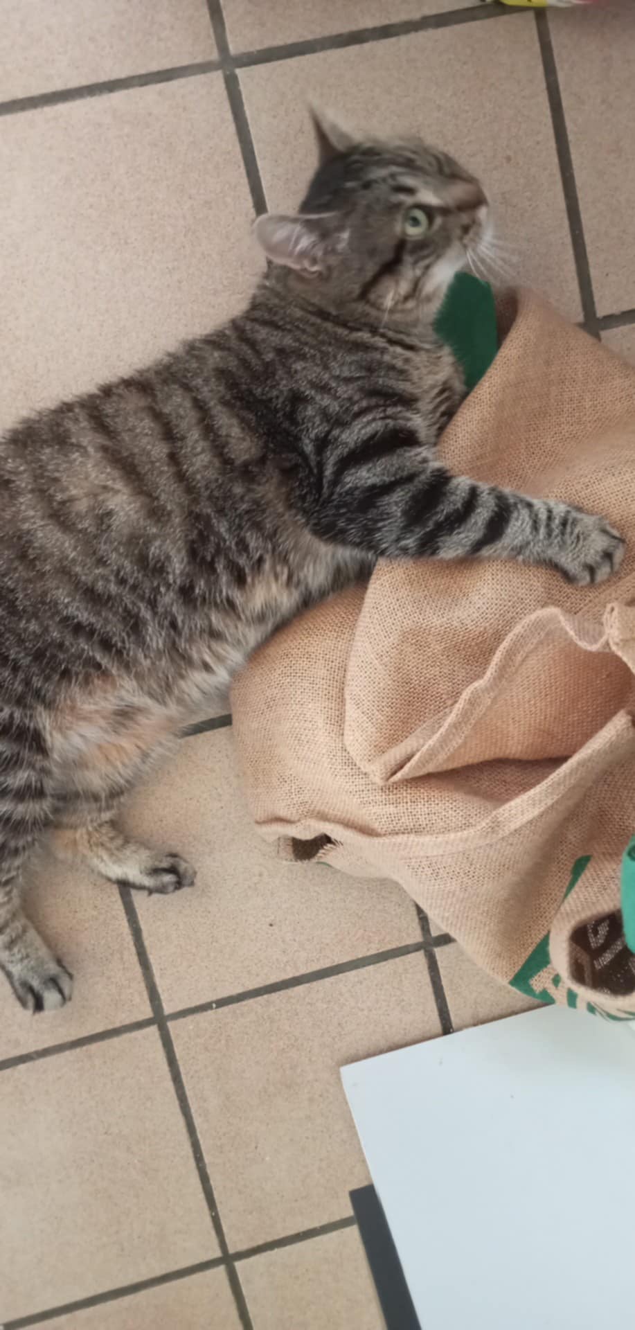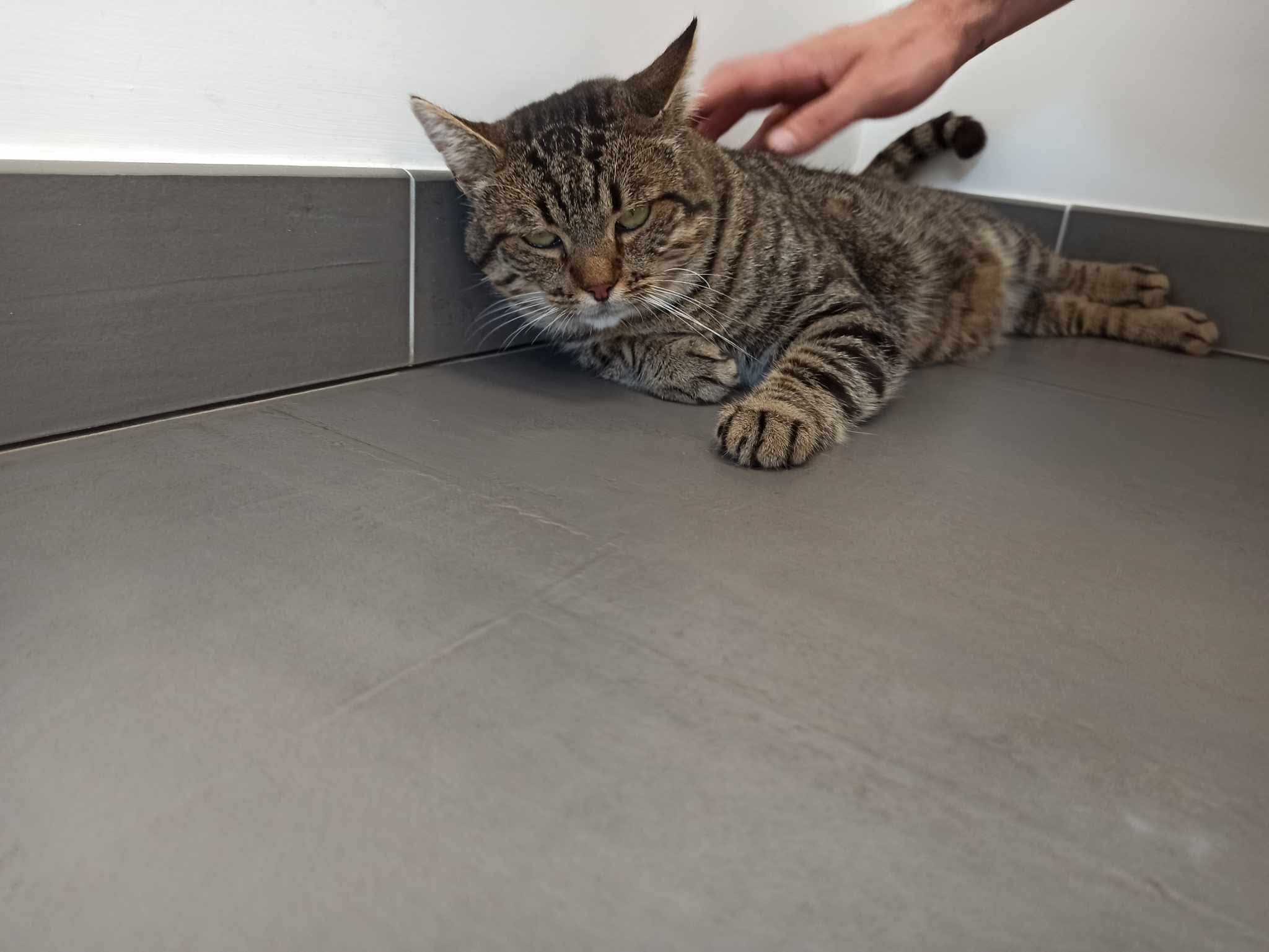 – Il s’agit donc d’un chat propre car il va au bac à litière, sage qui supporte très bien l’enfermement dans sa chambre de quarantaine, hyper sociable et très câlin avec l’humain que la vétérinaire aurait été bien en peine d’euthanasier nous a t’elle dit sans avoir même cherché à savoir si des soins étaient possibles et nous sommes entièrement d’accord avec ce point de vue et l’en remercions !